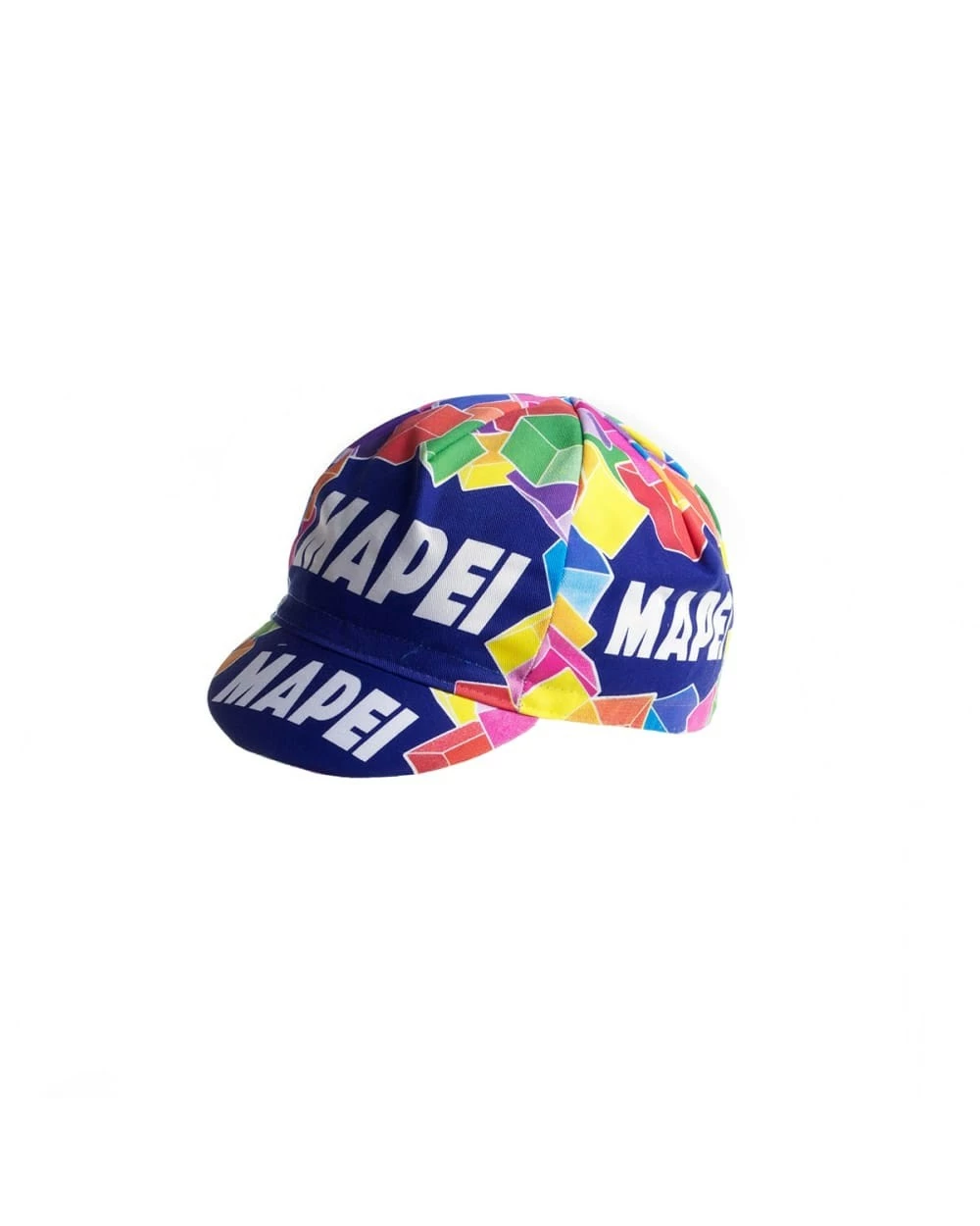 La casquette est une reproduction de celles portées par l’équipe italienne Mapei, spécialistes des Classiques et des courses d’un jour dans les années 90. Johann Museeuw, Toni Rominger, Frank Vandenbroucke ou encore Andrea Tafi sont autant de figures du cyclisme débridé des années 90 et qui ont rendu célèbre les couleurs de l’équipe Mapei.