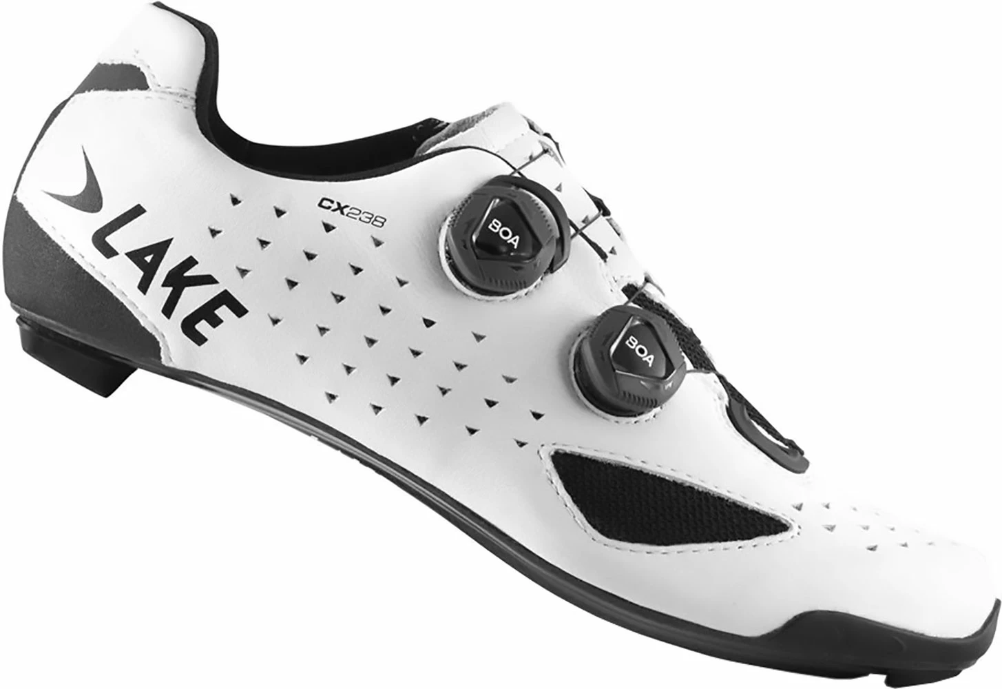 The Lake CX 238 is a top class road bike shoe. The robust upper with abrasion-resistant Helcor® leather panels is wrapped optimally around the foot by double BOA IP1 closure and provides secure hold. The ultra-stiff 100% carbon sole with Mountain Race X rubber tread and Competition Last gives the shoe a low weight.