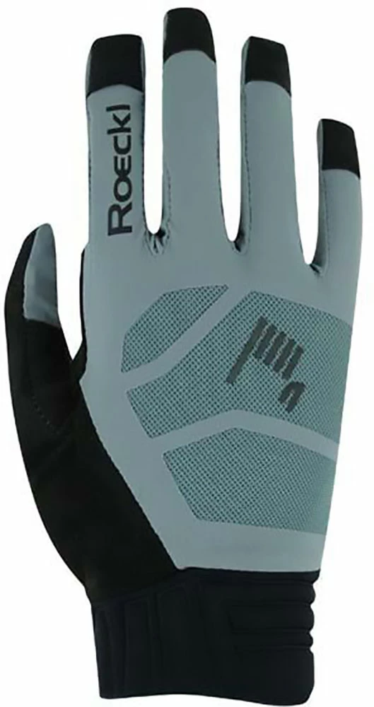 The soft but grippy ECO.SENSE® on the palm and wipe thumb feels like suede, but is made of 60 percent recycled and 40 percent conventional polyester. And the material of the TOUCHSCREEN COMPATIBLE function has 60 percent recycled content. Plenty of comfort on long distances or rough terrain is provided by ROECKL’s COMFORT-INNOVATION thumb flex padding and thin, durable XRD® Technology padding. For non-slip and tactile grip on the handlebars, the siliconization is responsible. Punched holes on the palm allow for noticeable ventilation of the palm. The look also speaks a cool language: the ROECKL lettering and the ROECKL transfer hand have been kept reflective, but tone-in-tone.