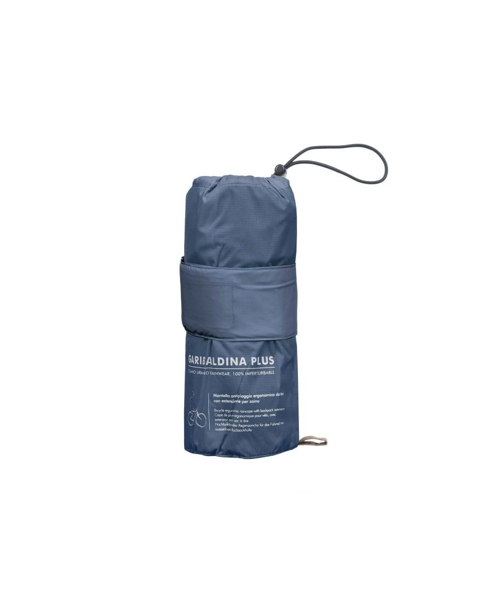 La cape de pluie Tucano Urbano Garibalina Plus est fournie avec une petite pochette qui peut se fixer directement sur votre vélo grâce à son large velcro.
